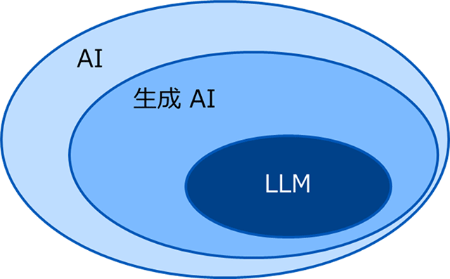 生成 AI は、文章、表、画像、音声などを新たに生成できる AI 技術の総称です。LLM(大規模言語モデル)は、自然言語処理に特化した生成AIの一種です。