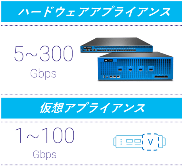 最大300Gbpsの防御パフォーマンスを提供するハイパフォーマンスモデルから、仮想アプライアンスまで、規模に合わせて最適なモデルを選択できます。