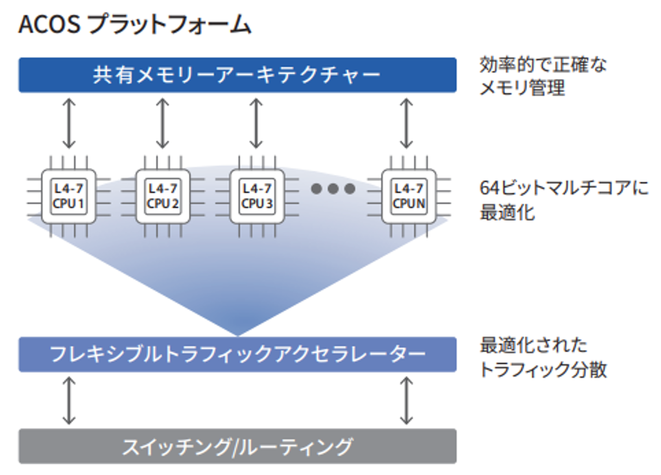 A10の独自OS「ACOS」は、マルチコアCPU特有の課題であるデータコピーやロッキングを解決。CPU性能の最大化とリニアな拡張を実現し、業界最高クラスのパフォーマンスを提供します。