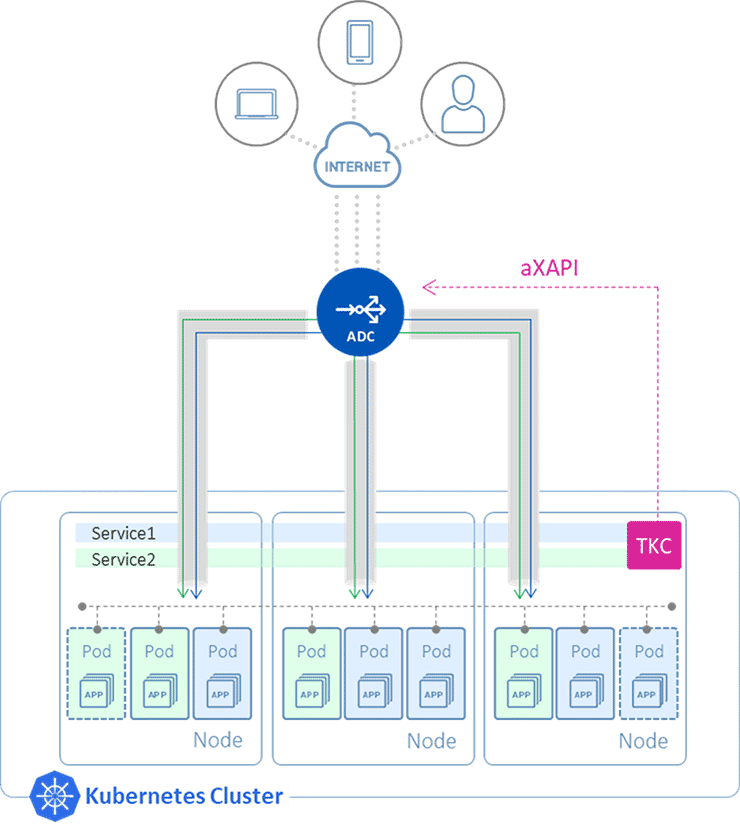 TKC:TKCはK8sクラスター内でコンテナとして実行され、Podが新規作成/スケールアップ/スケールダウンされる際、A10 Thunder ADCを自動設定します。